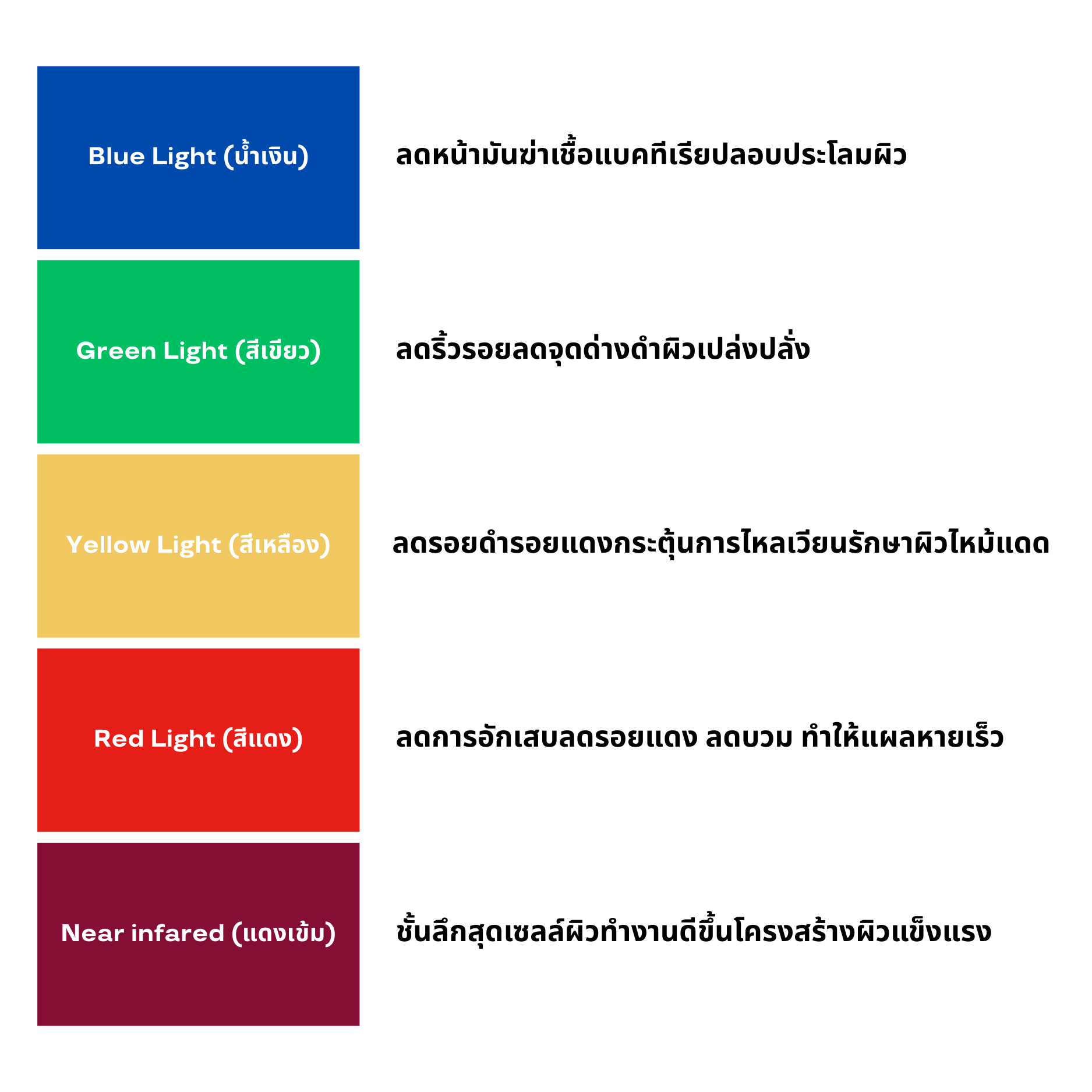 แสง LED แต่ละช่วงความยาวคลื่นจะทำงานในระดับความเข้มที่แตกต่างกัน เพื่อกระตุ้นกระบวนการฟื้นฟูของเซลล์ผิว ช่วยลดการอักเสบและเสริมการทำงานของผิวให้กลับมาแข็งแรงขึ้น การรักษาด้วยวิธีนี้ไม่ทำให้เกิดความเจ็บหรือการระคายเคืองระหว่างการทำหัตถการ ไม่ทำให้เกิดบาดแผลหรือตกสะเก็ด และไม่จำเป็นต้องพักฟื้นหลังการรักษา